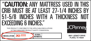 This recall includes Rockland Furniture round cribs imported and sold by jcpenney from 1/2005 to 12/2008. The round cribs used plastic hardware to attach the drop side. The model number can be found on a rectangular label located on the lower portion of the headboard panel.