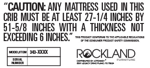 On the inner panel of every crib, there is a serial label identifying it as a Rockland Furniture crib. Crib could either have one of these two labels.
